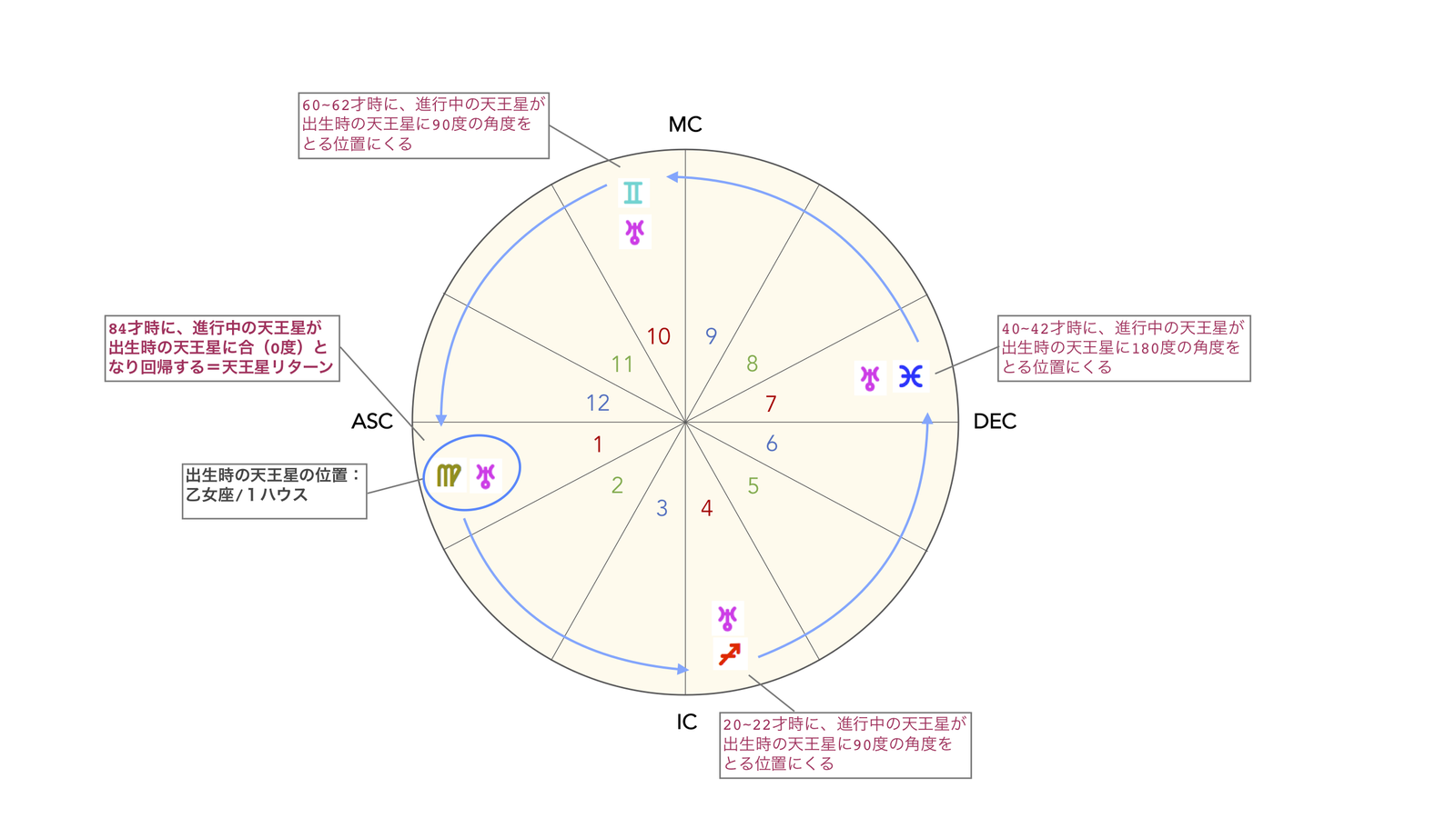 天王星も同様に、人生の大きな変化を促すトリガーポイントがあります。天王星は太陽の周りを84年かけて一周します。