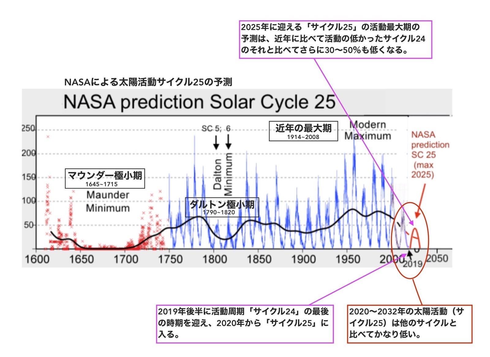 2020年~2032年のサイクル25の中で、2025年あたりに迎える最大の活動値はサイクル24の最大値よりも30~50%も低くなるというのです。